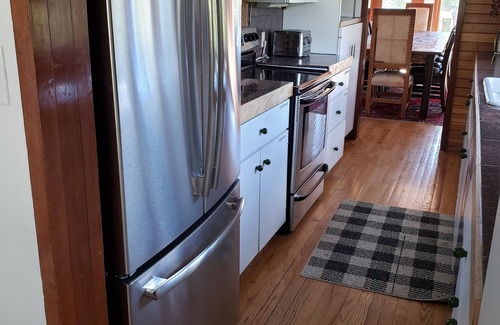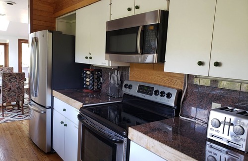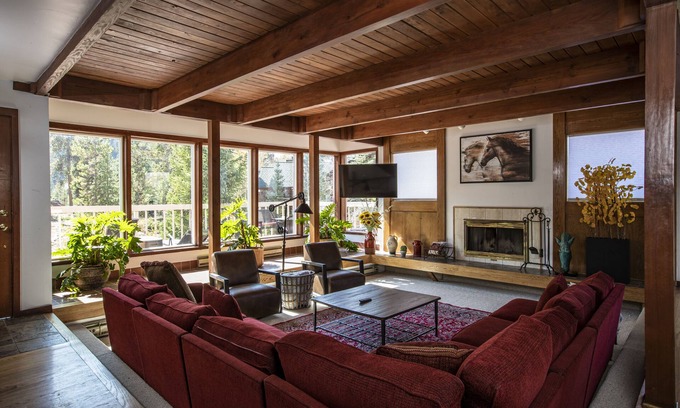 The main floor offers a spacious sunken living room with wood-burning fireplace, cozy sunroom with an additional potbelly stove and walks out to a large deck, the kitchen is fully equipped and the dining room provides an extra-large dining table that seats 10.