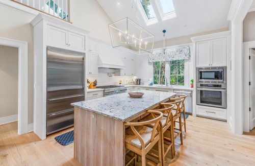 On entry, the foyer leads to a large bright and airy kitchen illuminated by windows and skylights with granite countertops, a breakfast bar, and large dining area adjacent to an outdoor deck with a BBQ grill and additional dining table and benches. The kitchen is truly a "chef's kitchen" featuring a 6 burner stove with 2 induction burners and 4 gas burners, a steam oven, two conventional ovens, a food processor, immersion blender, Le Creuset cookware, an air fryer and more! The first floor features a great room with high vaulted ceilings, natural sunlight, and windows that open to the deck overlooking the lagoon. The furnished screened porch is the ideal spot for relaxing or enjoy an afternoon drink on one of the three decks. Also included is a separate laundry room that opens to the front of the house near the outdoor shower and the two car garage. Quality Wi-Fi and Live TV are provided via YouTube TV for indoor entertainment.