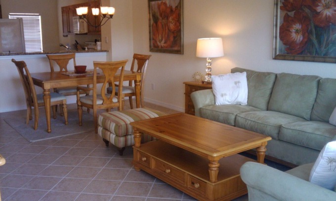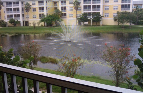 Our beautiful condo has two bedrooms and two bathrooms. The kitchen is upgraded and includes granite countertops and custom wood cabinets and has all the cooking amenities of home. It can sleep 4-6 people very comfortably. There is a queen bed in the master bedroom and a queen bed in the guest bedroom as well as a pull out full sofa bed . The bathrooms are upgraded and have granite countertops, as well as custom wood cabinets. There is also a full size washer and dryer. The entire unit has been custom decorated and setup to give our guests a relaxing and peaceful Florida vacation The condo overlooks the community lake and fountain. One of the most relaxing things to do is to sit on the large screened lanai. There are beautiful views of the lake from the lanai and master bedroom and livingroom.
