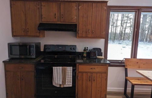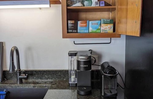 * **Rustic kitchen** with granite countertops, modern appliances, Keurig + Nespresso machines for your perfect morning coffee.