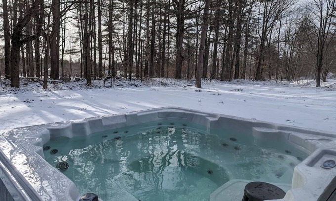 * **Private backyard** surrounded by trees — perfect for morning coffee, leaf-peeping, or stargazing from the hot tub.