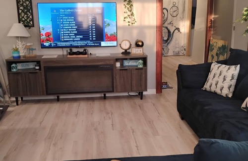 Relax in the cozy living room featuring a 55" TV with an electric fireplace beneath it.