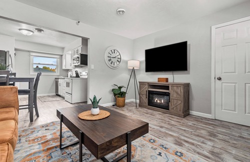 1. Living Room: Cozy up in our living room with a comfortable sofa that features a 55" HD Roku TV perfect for movie time!