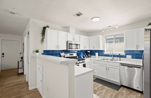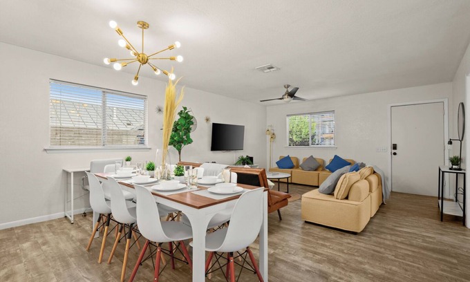 Experience the best of East Austin in this modern 3-bedroom home just minutes from downtown. With stylish decor, bright natural light, and a fully equipped kitchen, this home is designed for both comfort and convenience. Relax in the cozy living room or unwind in the private, fenced backyard. Each bedroom offers the perfect retreat after a day exploring Austin’s vibrant scene. Whether you're here for the music, food, or outdoors, this location puts you close to it all.