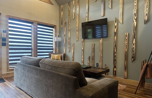 The cabin is brand new, completed in November ‘22. There are 2 bedrooms, one is a spacious loft with king sized bed, the other is a bunk room with 2 twin beds. The sofa also converts to a queen.