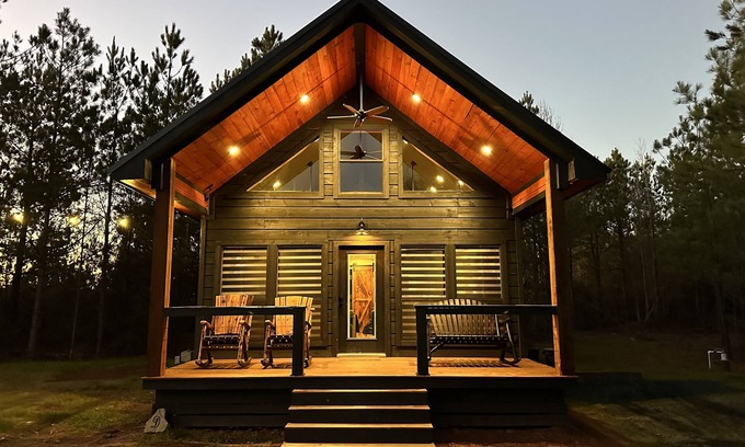 The front deck has 2 large wooden rocking chairs and a rocking bench to enjoy sitting out and taking in the sounds of nature- be sure to sit out after dark, turn off the cabin lights and check out the stars.