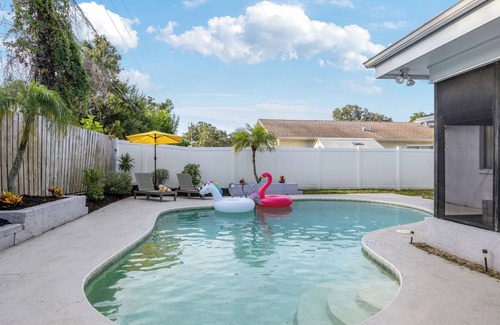 While the pool is not heated, you'll find it's perfect for refreshing dips during Florida's warm and sunny days. The natural warmth of the Florida climate ensures a comfortable and enjoyable swim year-round. The pool is not covered, so natural debris like leaves, grass, and bugs may occasionally fall into it. The pool is cleaned weekly on Mondays and a net is provided for your convenience if you'd like to scoop out any debris. Please understand that refunds will not be issued for debris in the pool.