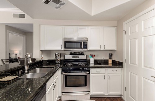 The well equipped kitchen includes stainless steel appliances and updated granite countertops and white cabinets. You will enjoy making dinners, or just grabbing snacks.
