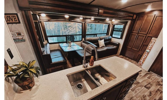 Two bedroom King RV/camper rental sleeps up to 10. Premium camping spot at Happy Camper RV Park 2 miles from Lake Cumberland. High Speed WiFi, full kitchen, indoor fireplace, Smart TVs, charcoal grill, fire pit, lawn chairs, picnic table, kids play area and free parking.