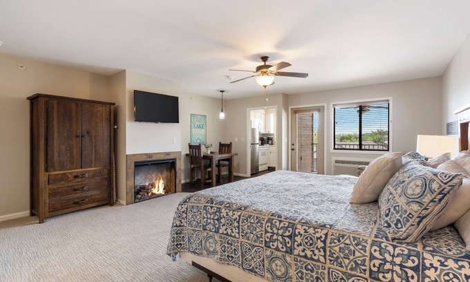 This studio condo has plenty of room and boasts a king bed and an electric fireplace. One of the highlights of this property is its private balcony where you can unwind with a cup of coffee in the morning (bring your favorite K-cups as a Keurig is provided) or sip cocktails while enjoying the sunset in the evening, all from the comfort of your new favorite vacation home!