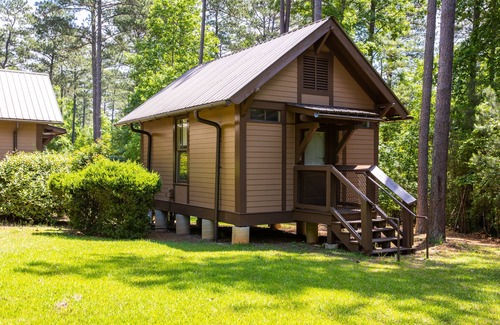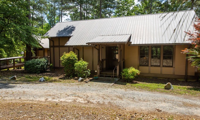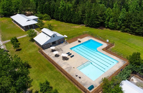 Common living area with fully stocked kitchen, restrooms, 4 toilet stalls, 4 shower stalls and 4 sinks with TV in Main Kingfisher cabin. This includes four climate controlled cabin pods containing eight structurally sound bunk beds in each. The pods, main cabin are booked privately to you and your guests. There are other options within park for overnight guests. Fire pit, grill, pool, dock, hiking and kayaking. Watercraft are available for a weekend deal. Sleeps a total of 34. Back porch with lake view. Located in a gated park called Pine Acres Retreat, formerly a Girl Scout Camp. We have a total of eight overnight sites from tent camping to indoor cabins. We have hot spot available for your working needs on request. Event venues, banquet hall, picnic pavilions. Perfect for getaways, retreats, reunions and weddings. Located on beautiful Lake Allatoona just north of Atlanta and just 8 miles from Lakepoint Sporting Community. Peaceful, secluded, gated park just 6 miles from Interstate 75.