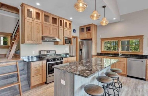 This peaceful home in the woods has two queen bedrooms and a loft (with two twin beds) overlooking the great room. The sectional sofa has a full-sized pull-out bed for anyone who prefers not to use the loft.