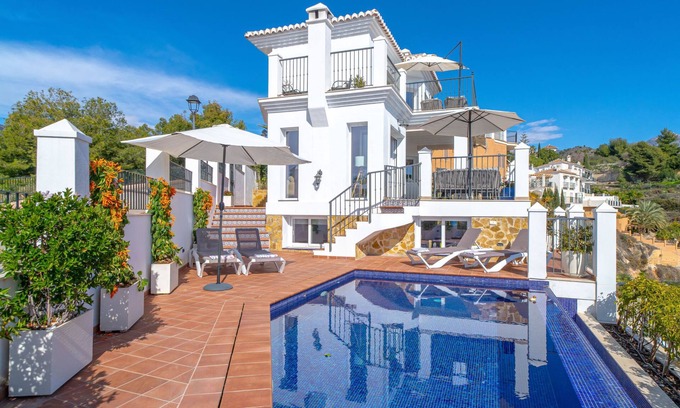 Frigilia 4 km from Nerja: Large, modern, beautiful villa "Kinkuna", 3 storeys. Outside the resort, 2 km from the centre of Frgiliana, in a sunny position residential area (villas), 4 km from the sea, 4 km from the beach, south facing position. Private: swimming pool angular (4 x 5 m, depth 140 - 180 cm, seasonal availability: 01.Jan. - 31.Dec.). Outdoor shower. In the house: sun terrace. Shop 2 km, supermarket 2.5 km, shopping centre 23 km, restaurant 1 km, bakery 2 km, pedestrian zone 2 km, bicycle rental 4 km, bus stop "Bus Frigiliana y Nerja" 300 m, sandy beach "Burriana" 4 km, diving center 4 km. Sports harbour 17 km, marina 17 km, golf course (18 hole) 30 km, surf school 40 km, sailing school 17 km. Nearby attractions: Golf: Baviera, Los Moriscos, Añoreta. 30 km, Competa, Torre del Mar, Almuñecar, Málaga, Granada. Well-known ski regions can easily be reached: Sierra Nevada. Hiking paths: Sierra Almijara, Sierra Tejeda, Las Alpujarras. Please note: car recommended. Baby equipment. The owner does not accept any youth groups. Loading and unloading of baggage is possible at the holiday house. Neighbourhood highly sensitive to noise. Quietness and good behaviour expected.