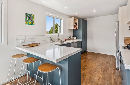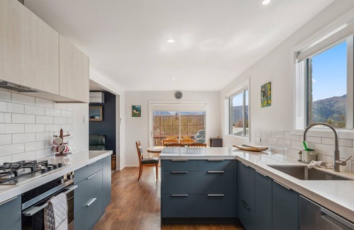 The modern kitchen is provided with quality appliances and offers plenty of bench space. The three bedrooms in this Lake Hawea holiday home make for a restful sleep, with a master bedroom featuring a king bed, a second bedroom with bunks, and a third bedroom with a queen bed. An additional bathroom with a bath and laundry facilitiy is also available to make your stay comfortable.