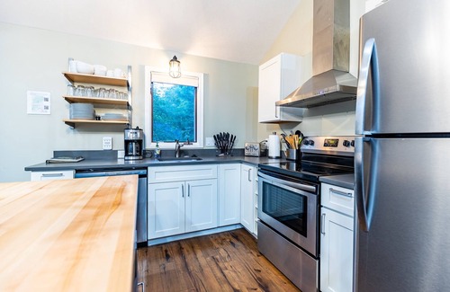 The kitchen is fully equipped with an ten person dining table. You’ll have everything you need to cook a meal, bake, or just make coffee + toast and use the microwave for simple reheating. Plus we have a dishwasher for easy clean up. We provide a blender, toaster, coffee maker, kettle, pots, pans, dishes and all utensils.