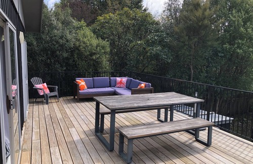Bedroom 1 at this Kuratau accommodation opens onto the deck and is fitted with a super king bed. Bedroom 2 includes 1 single bunk set and a single bed. Bedroom 3 has a queen-sized bed and a trundler bed. This is a great option for up to 8 guests!
