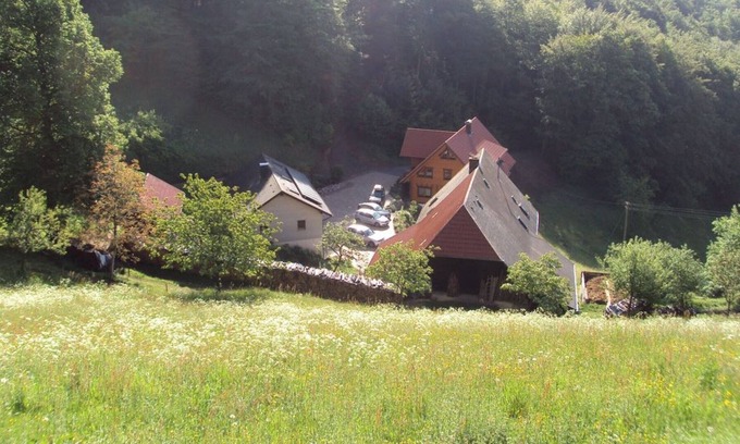 Our apartments are located in a pure solid log house, which was completed in early 2006. Here in the house we offer three apartments, which are suitable for 1 - 4 people. Each apartment has a fully equipped kitchen, TV, telephone and Internet (WLAN), so you will not miss anything and you can enjoy your holiday in free moves. Enjoy the light scent of wood and draw strength and new energy from it. The apartments are especially child friendly. For the little ones you will find a high chair and children's cutlery, so that even the little ones feel comfortable with us. Outside the log cabin with its apartments you will find on the farm in summer a sunny lawn with sun loungers, which is bounded by a small babbling brook and the green meadows invite the children to let off steam and to experience little adventures at the edge of the forest.