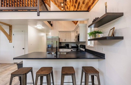 The kitchen is fully equipped with cooking utensils, microwave, oven, pots and pans, blender, a drip coffee maker as well as Keurig, dishwasher and large fridge. The kitchen is stocked with dish soap, dishwasher pods, K cups (20 provided per booking), coffee filters, fresh coffee grounds, one roll of paper towels, a fresh sponge, and tea towels.