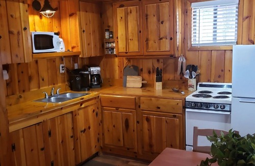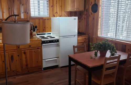 The Knotty Bear Cabin is secluded, providing guests with privacy and the ultimate opportunity to experience the great outdoors without compacted parking, close cabin proximity or noisy resort activities. Why not experience Greer as it was meant to be enjoyed? Peace, quiet and the opportunity to relax in the seclusion of a private cabin! Knotty Bear is pet friendly and includes a dog run. Please remember, Knotty Bear is a non-smoking cabin! We provide bed linens, towels, toiletries, SOME paper products, trash bags & dish soap. Our kitchen is stocked with basic needs to prepare and serve a family meal. We also provide a backup of ground coffee, sugar, creamer & tea. K-cup brewer & pods available upon request but there is a regular coffee brewer and a tea kettle there. We have a mid-size fridge, four-burner electric range/oven, microwave & drying rack for dishes. The bathroom has a full-size tub/shower, toilet and vanity with storage. Both bedrooms have rods w/ hangers and storage with a chair and luggage rack. The loft has a low ceiling so it is great for kids to sleep or play games. The ladder may be dangerous for small children. Our fireplace is converted to an electric heater that provides cabin ambiance but is safe and clean. Each room has a heater also. We provide propane for the modern gas grill on the porch, grill tools, foil and plastic wrap.