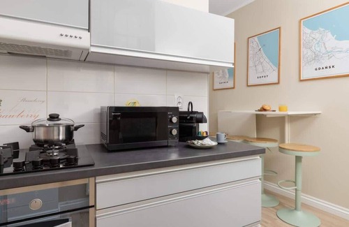 This unique apartment of 42 m² will comfortably accommodate 4 people. The combination of modern yet cosy interiors with historic surroundings is an excellent choice for those who value comfort with the timeless charm of a historic building. The apartment will be suitable both for a holiday stay and for business travellers. The layout of the rooms includes a living room, a kitchen, a bedroom and a bathroom with a shower. The living room impresses with its comfort, where a comfortable, soft sofa with a sleeping function for two people invites you to relax and rest. Bright interiors with tastefully selected accessories introduce a unique atmosphere that will ensure a pleasant stay. The functionally furnished KITCHEN, equipped with high-quality appliances, is the ideal place for preparing home-cooked meals. A bright, cosy bedroom with a comfortable double bed provides rest and regeneration after an eventful day. The room has been arranged with a desk, which will prove useful when working or studying at the computer. The spacious bathroom has been equipped with a washing machine and hairdryer, which is invaluable during a longer stay. Evening entertainment is provided by multimedia, such as flat-screen Smart TVs with Play TV, as well as complimentary Wi-Fi access. Guests are provided with complimentary toiletries, towels and bed linen for a good start.