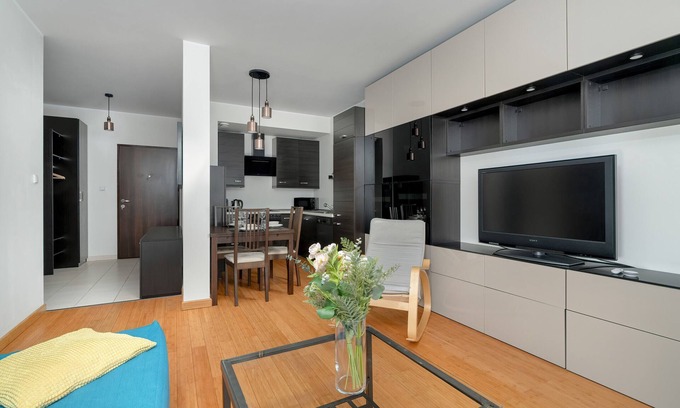 This comfortable apartment has the ability to accommodate up to 4 people. It is ideal for families visiting Poznan or for a getaway for a group of friends! The highly functional space with a living area of 44 m² offers a living room with a kitchenette and dining area, a bedroom and a bathroom with a shower. The spacious living area, equipped with a comfortable sofa, is the perfect place to relax. The bedroom has a very comfortable double bed, and the living room has a comfortable sofa bed. High-speed, free Wifi Internet is available in the apartment. A wide range of amenities and comprehensive equipment of the apartment with the necessary accessories and kitchen and bathroom equipment guarantee a comfortable stay. To facilitate the start of each visit, a complimentary set of toiletries (soap, shampoo and shower gel), towels and linens are provided. A remarkable advantage of the apartment is also a spacious balcony, where you can spend time outdoors. The bright rooms are decorated in a modern style, while subdued accessories and the presence of decorative elements give the apartment a calm atmosphere. The interior is pleasantly arranged, spacious and functionally designed, meeting all the needs of guests. There is a paid parking zone under the block (no space guaranteed). Guests traveling with a child, have the opportunity to use a crib (available on request, additional fee applies).