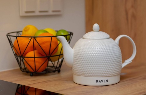 Electric kettle, fridge with a freezer, induction hob, microwave, dishwasher, coffee maker, kitchenware and tableware