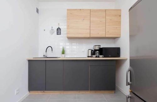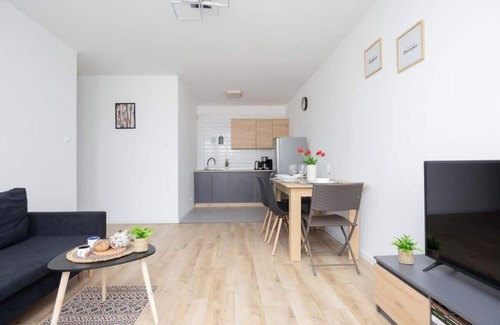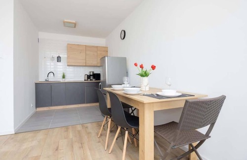 The 38 m² apartment is designed for four people, offering comfort and functionality in a modern way. The living room with kitchenette is the heart of the apartment, which was designed with comfort and functionality in mind. Subdued colors and elegant accessories create a cozy atmosphere. The spacious living room is equipped with a modern sofa, a table with four chairs and a TV with access to cable channels. Thanks to large windows, the interior is full of natural light. The kitchenette, which is an integral part of the living room, is fully equipped with modern appliances, such as a refrigerator, dishwasher and induction hob. All necessary dishes and utensils are at guests' disposal. From the living room you can step out onto a cozy balcony, where you can enjoy the fresh air while drinking your morning coffee or relaxing after a long day. A separate bedroom is an oasis of calm, designed for maximum comfort. It features a comfortable double bed with a high-quality mattress, bedside tables with reading lamps and a spacious closet for clothes. Subdued colors and elegant accessories create a cozy atmosphere. The modern bathroom is equipped with a shower cubicle, a sink with a large mirror and a toilet. In addition, towels and basic toiletries are at guests' disposal.