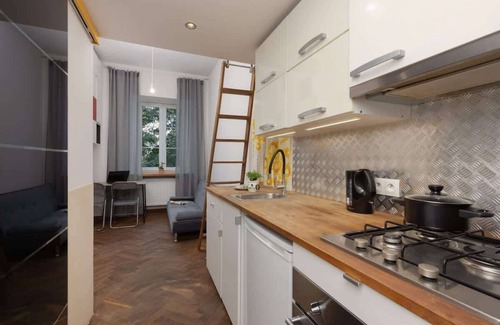 The cozy studio apartment is located on the first floor of the building and can accommodate up to three people. The functional space with a total area of 17 m² offers a living room with a sofa bed, a kitchenette and a bed on the mezzanine and a bathroom with a shower. The place is an ideal accommodation for travelers who want to enjoy the unique atmosphere of the Capital. A consistent color palette in fashionable hues and modern furnishings give the whole place an interesting atmosphere. Guests' comfort will undoubtedly also be influenced by multimedia amenities such as free WiFi connection, TV with cable channels and necessary kitchen (kettle, oven) and bathroom (washing machine, hair dryer) equipment. Guests are provided with complimentary toiletries, towels and linens for a good start to their accommodation. Those traveling with pets are welcome - pets are accepted at this property for an additional fee.