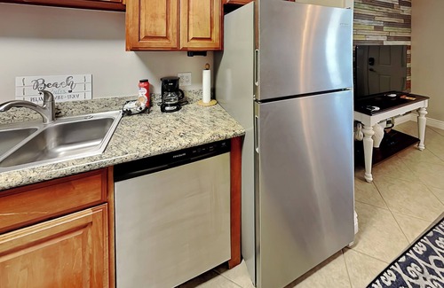 The ensuite bathroom includes a single vanity and a refreshing shower. The complex offers convenient amenities such as elevators, a pier, coin laundry, boat slip availability, and free parking. Guests can also enjoy the community pool and boat ramp. Beach access is just a short distance away, making it easy to spend your days lounging by the water.
