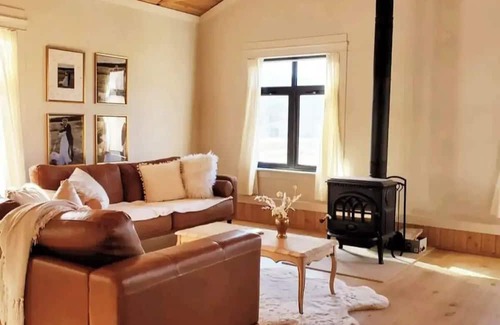 Unique living Suite with wood fireplace, exposed timber interior, farmhouse kitchen, small sleeper loft, full bathroom, office area, and a bedroom.