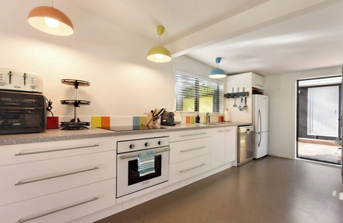 The open-plan kitchen, dining, and lounge create a welcoming space to relax, while a sliding door leads out to a deck perfect for BBQs or alfresco meals. Stylish touches and cosy furnishings create a welcoming atmosphere, and the sleepout provides extra flexibility and privacy.