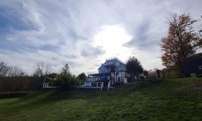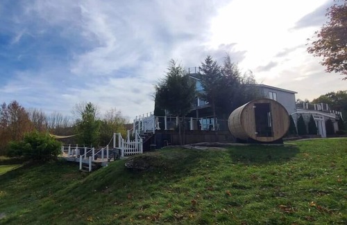 Whether it's a nice summer weekend, hiking trip through the fall foliage, or winter wonderland getaway, this house is perfect for families to enjoy a relaxing getaway in upstate New York. This house is located on a lake front property up against a wooded area that is serine and beautiful to take in. The house boasts 9 bedrooms that sleeps 18 in total, and has 5 full bathrooms. Minutes drive to Casino, indoor water park, hiking and family ski are. this home is a epic family getaway upstate. The house has 22 foot ceilings along with a massive outdoor porch and lounging space, state of the art indoor/outdoor fitness center, pool table, ping-pong, 10 person hot tub and barrel sauna with out door shower.