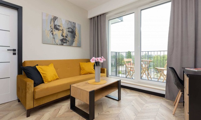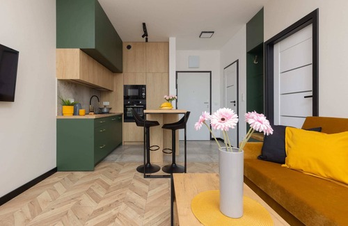 This fully equipped, modern apartment can comfortably accommodate up to 4 people. The 34 m² area is divided into a living room with a double sofa bed, a kitchenette, a separate bedroom with a double bed and a bathroom with a shower and toilet. The living room has access to a balcony overlooking the neighboring street. The interior is finished with attention to every detail, in a stylish color scheme creates an elegant atmosphere. The facility's space is functionally designed, meeting all the needs of guests. Amenities include multimedia equipment (flat-screen TV and free Wi-Fi), kitchen and bathroom facilities (washing machine, hair dryer). To facilitate the start of each stay, complimentary toiletries, towels and linens await guests.
