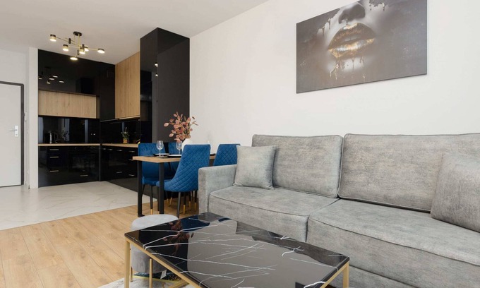 The flat, finished in an elegant style, can accommodate 4 people on an area of 40 m2. The interior consists of a living room with a double sofa bed, a kitchenette, a separate bedroom with a double bed and a bathroom. From the living room there is access to the balcony, where you can sit on the comfortable armchairs and let yourself relax while enjoying a cup of coffee. The kitchen area is equipped with all the necessary kitchen utensils, allowing guests to prepare delicious home-cooked meals. Both the kitchen area and the living room are furnished with black furniture, which, combined with gold elements, create a coherent composition, giving the interior a classic and modern look. The facility's space is functionally designed, meeting all the needs of guests. Amenities include multimedia equipment (flat-screen TV and free Wi-Fi). In addition, an iron, ironing board, hoover and washing machine are available in the flat. The bathroom has free toiletries, a towel and a hairdryer. A separate bedroom with a desk provides guests with privacy and creates a comfortable environment for remote working. The flat comes with a private parking space on a platform in the underground garage.