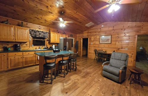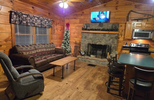 Open floorplan boasts smart TV above the rustic stone fireplace, fully stocked kitchen & island bar, kitchen table, 2 smart TV's, & ceiling fans. Rocking chairs on front porch, Grill on the back deck with BBQ and patio set. Roast marshmallows for smores around the fire pit while stargazing.