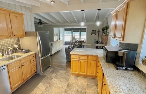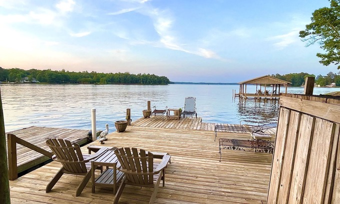 This cozy 1,400 sq ft. lakefront 3/2 cottage has been fully renovated. Enjoy the beautiful air conditioned sun room with stunning views while you sip your morning gourmet coffee provided by owners. By day entertain your family and friends on the large dock with swimming, kayaking, or using the SUP (owner provided kayaks and SUP). The spacious deck provides a great spot to cook meals on the gas grill and wind down in front of the custom made fire pit while cooking s'mores and making memories.