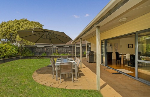 The warm and welcoming open plan living arrangement in this 2-storey Matarangi holiday home is perfect for stays year-round. The fireplace is an excellent addition when you're in need of a toasty winter getaway, or make the most of the fantastic summer set up - there is plenty of outdoor seating for classic kiwi BBQ's, and the spacious, flat section easily caters for kids!