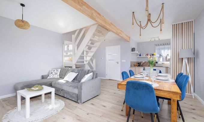 This charming wooden cottage at Kropla Bałtyku 6A in Darłówko is the perfect place for a quiet and comfortable holiday close to nature. The cottage has one floor and offers a space designed with the comfort and relaxation of guests in mind. An additional advantage is the fence around the garden, especially for owners of four-legged pets. Inside, there is a bright and spacious living room with a dining area, which combines elegance with coziness, creating a perfect place to spend time together. The fully equipped kitchen delights with a warm atmosphere thanks to the white arrangement with wooden accents, and the bright bathroom with a shower, washer-dryer and a set of cosmetics ensures comfort during your stay. On the first floor, there are two bedrooms - one with a comfortable double bed, and the other bedroom with four single beds, which makes the cottage a great place for both families and groups of friends. An additional advantage is the covered terrace, where you can relax on deckchairs and enjoy the fresh air. The whole is complemented by a cozy garden, which allows you to spend time outside surrounded by nature. The cottage is a harmonious combination of functionality, style and a friendly atmosphere.