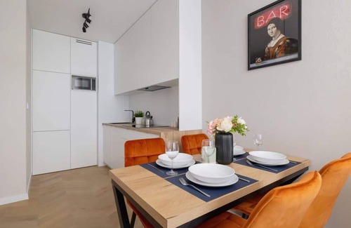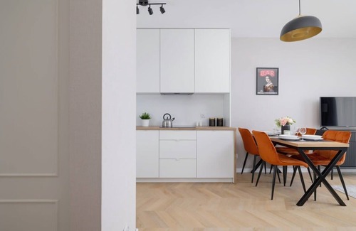 This modern apartment sleeps four in a prime location on Krowoderska Street, in the center of Krakow. It offers express self-check-in and check-out and quick access to the market square. Guests have access to air conditioning, a desk for remote work, a parking space, and a bathroom with a bathtub. Toiletries, towels, and bed linen are included in the price. A VAT invoice can be issued upon request.