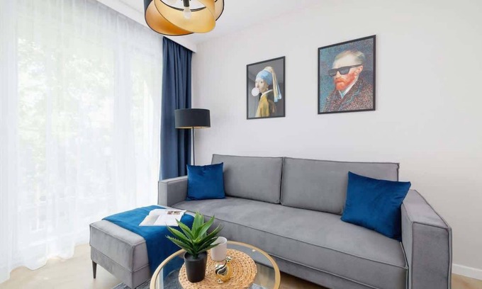 This exclusive and prestigious apartment is located on the fourth floor of a modern building and is designed for four people. Air conditioning is available in the premises, which ensures a comfortable stay. The interior design is elegant and associated with luxury. Dark, as well as wooden accents and carefully selected decorations take care of the variety of the bright space. The dominant color here is white, although shades of gray, blue or yellow can also be found in the rooms. The living room features a double sofa bed, a dining table with chairs, a cabinet for handy trinkets and a table where one can sit to relax with cable television. The room also has access to a balcony, from which you can enjoy the peaceful, green surroundings. The bedroom has a large double bed, a roomy closet and a desk with a chair for comfortable remote work. Meals can be prepared in the functionally furnished kitchenette - at the disposal of visitors here are such appliances as a microwave oven, gas kettle and refrigerator with freezer. In the bathroom, a welcome toiletries kit, towels, a washing machine, a hair dryer and a bathtub await guests, which is ideal for those who appreciate luxurious evening relaxation. Parents traveling with a baby can use the crib available in the apartment.