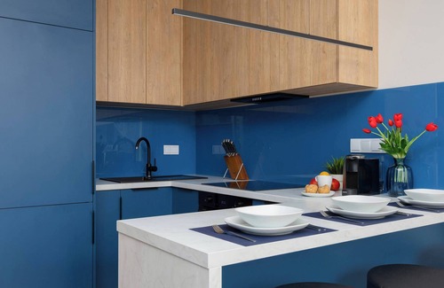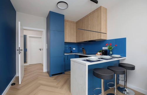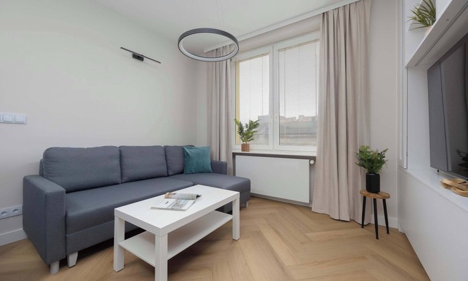 This stylish apartment, with an area of 45 m2, offers functional equipment and the highest comfort during your stay. It will happily accommodate 6 people. The living room has a sofa bed, a coffee table and a TV with SmartTV function. The first bedroom has a large and comfortable double bed and a spacious wardrobe for storing clothes or shoes. The second bedroom also has a double bed and a desk, allowing for comfortable remote work. In the kitchenette, you can quickly and conveniently prepare meals using appliances such as a microwave, oven and induction hob. There is full equipment necessary for cooking tasty, home-made dishes. The bathroom has a shower, hairdryer, towels and a welcome set of cosmetics. This apartment will be a great place for a successful stay in the heart of Warsaw.
