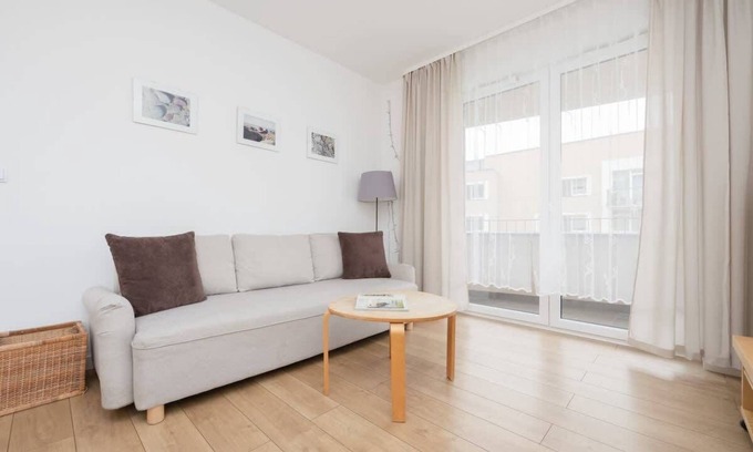 The bright 50.69 m² apartament is ideal for a stay of up to four people. It consists of two comfortable bedrooms, an independent kitchen, an elegant bathroom and a cosy balcony. The first bedroom has a comfortable sofa, a TV, a practical chest of drawers and a table with four chairs, ideal for dining or spending time with loved ones. There is also a furnished balcony where you can enjoy relaxing in the fresh air. The second bedroom has been designed with comfort in mind - there is a spacious double bed and a desk, creating the perfect environment for remote working. The kitchen is fully equipped with a fridge, oven, dishwasher, microwave and electric kettle, allowing you to prepare meals at home. In addition, there is a table with three chairs, ideal for everyday meals. The bathroom, decorated in a harmony of white and wood, offers full comfort - there is both a shower and a washing machine, making this flat ideal for longer stays. The flat also comes with a parking space in the underground garage. This flat is an ideal choice for families, couples or business travellers looking for comfort and convenience.