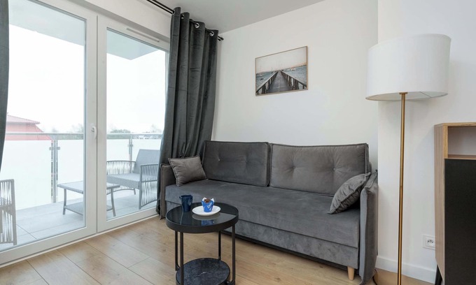 This modern building is located in a friendly seaside neighborhood, making it a great place to relax for parents traveling with their kids, groups of friends and business travelers. There is a children's play space next to the property, and a parking space in the garage is available for motorized guests. The beach can be reached on foot in just a dozen minutes, and there is a water park just a 7-minute walk from the property. At the same time, you can walk to the restaurant and the nearest grocery store, which provides the convenience of daily shopping, as well as the opportunity to enjoy a nice meal. Lovers of greenery can reach a landscape park in 4 minutes, and there is a museum 4-5 minutes away from the building and a lookout point for enjoying the picturesque landscapes. The route to the railway station, on the other hand, takes 12 minutes. It takes the same amount of time to reach the shopping center by car.