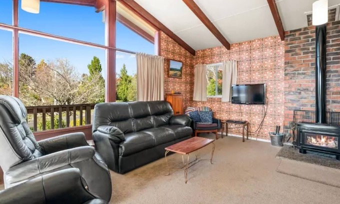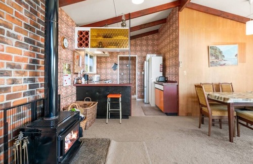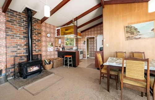 Just moments from the shores of Lake Taupo, welcome to your Relaxing Retro Retreat in Kuratau! This stylish family getaway beautifully blends '70s charm with modern comforts. As you step inside, you’ll be greeted by vibrant patterned wallpaper and cozy furnishings. The sun-soaked open-plan living area features a wood-burning fireplace, ensuring warmth and comfort year-round. Gather around the leather couches and dining table, or flow seamlessly into the lively kitchen, designed for family gatherings and group fun.