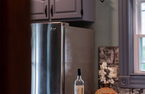 The dining area seats up to 6 people and is located in the fully equipped kitchen that features custom countertops and a 200 year old antique light fixture. The kitchen has brand new stainless steel appliances, a keurig/drip coffee maker with all your coffee needs, a bean grinder, silverware, plates, cups, bowls, knife set, can opener, measuring cups, mixing bowls, strainer, blender, baking sheets, and ice maker.