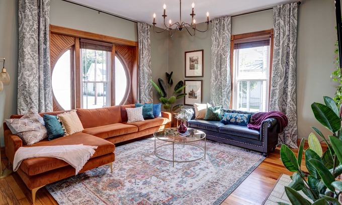 The open living room features extra comfortable seating and a Smart TV. Guests will immediately notice the gorgeous window that is the focal point of the living room. There are only 4 of these breathtaking windows in the area and the rare glass pattern was sourced circa 1890-1905 from Chances Bros. in Birmingham, England.