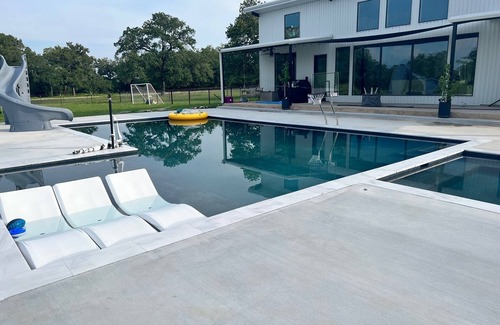 Privacy and Nature's Beauty all within this modern home! Pool with slide and extra large hot tub overlooking stunning views of acreage. Large kitchen and common areas for entertaining. A master shower that pampers you and individualized bedrooms with private bathrooms! Or maybe it's the black out curtains closed or open to enjoy the pristine views both day & night! Equipment for basketball, trampoline, corn hole, giant connect four, and pool table are additional activities. Detached carport has a small apartment providing additional sleeping with queen bunks and a king bed, full bath, and fridge for extra hospitality if necessary. This home provides everything you need from easy access to campus/Kyle Field, enhanced amenities for everyone, and privacy that allows for relaxation and enjoyment throughout your entire stay.