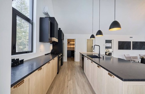 The common areas are designed for comfort and togetherness. The upper floor features an open-concept living area with a cathedral ceiling, flooding the space with natural light. The fully equipped kitchen has everything you need to prepare delicious meals, including a raclette set, electric fondue pot, freezer, and blender. The spacious living room, with its inviting fireplace and a 60-inch TV, is the perfect spot to unwind after a day of adventure. Entertainment lovers will enjoy the ping-pong table, while a small workout area with dumbbells helps you stay fit even on vacation. Enjoy the comfort of heated floors on both levels, ideal for any season but especially cozy in winter. Indulge in a luxurious bath with views of the forest for the ultimate relaxation. Fast Wi-Fi and a dedicated workspace make it easy for those who need to work remotely in a fresh and inspiring environment.