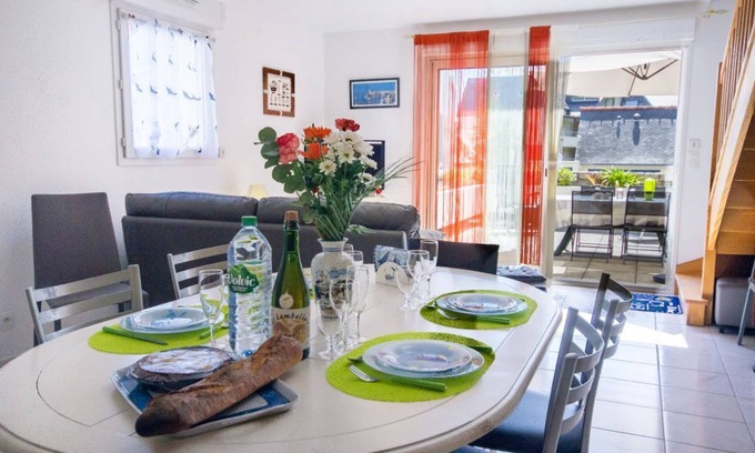 Your duplex apartment, within a residence of good standing includes, on the ground floor, a beautiful fully equipped kitchen, a bright dining room and a comfortable living room with a flat screen TV, separate WC with washbasin . Upstairs, a bedroom for 2 people offers 2 90x190 beds, the second bedroom with a small sea view offers a 160x200 bed for 2 people, the bathroom is equipped with a shower and WC. Your private parking space is reserved for you in the garage. You benefit from a pleasant south-facing terrace with awning Do you dream of a vacation by the sea? Your destination has been found... Book this apartment quickly, which is located just 100 m from a large fine sandy beach. Pleasantly furnished, this rental will be your ideal vacation spot. Depending on the municipality of Erquy, this seaside resort full of charm offers many activities. During your stay, beautiful excursions are available to you. Take the opportunity to discover famous tourist sites such as Cap Frehel, Fort Lalatte and Cap d'Erquy....