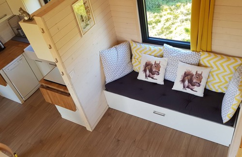 The ecological cottage of L'Ecureuil can accommodate up to 10 people. It has two bedrooms with bathrooms, two mezzanine bedrooms and a bench that can be converted into a double bed (140 cm wide).